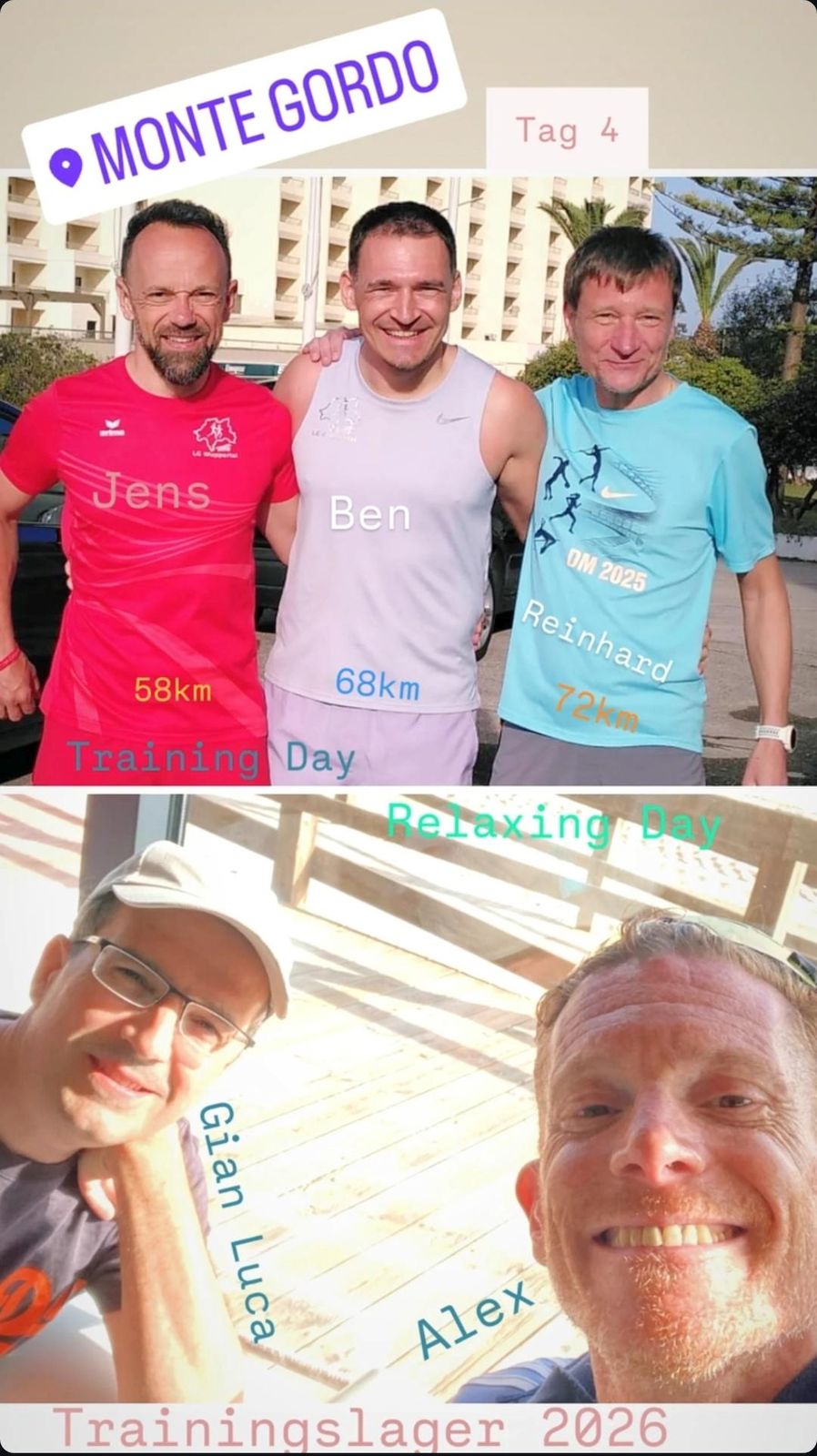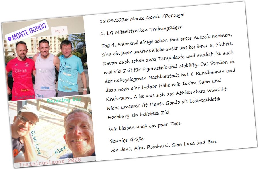 »Tag 4, während einige schon ihre erste Auszeit nehmen, sind ein paar unermüdliche unter uns bei ihrer 8. Einheit. Davon auch schon zwei Tempoläufe und endlich ist auch mal viel Zeit für Plyometric und Mobility. Das Stadion in der nahegelegenen Nachbarstadt hat 8 Rundbahnen und dazu noch eine Indoor Halle mit 100m Bahn und Kraftraum. Alles was sich das Athletenherz wünscht. Nicht umsonst ist Monte Gordo als Leichtathletik Hochburg ein beliebtes Ziel. Wir bleiben noch ein paar Tage.
