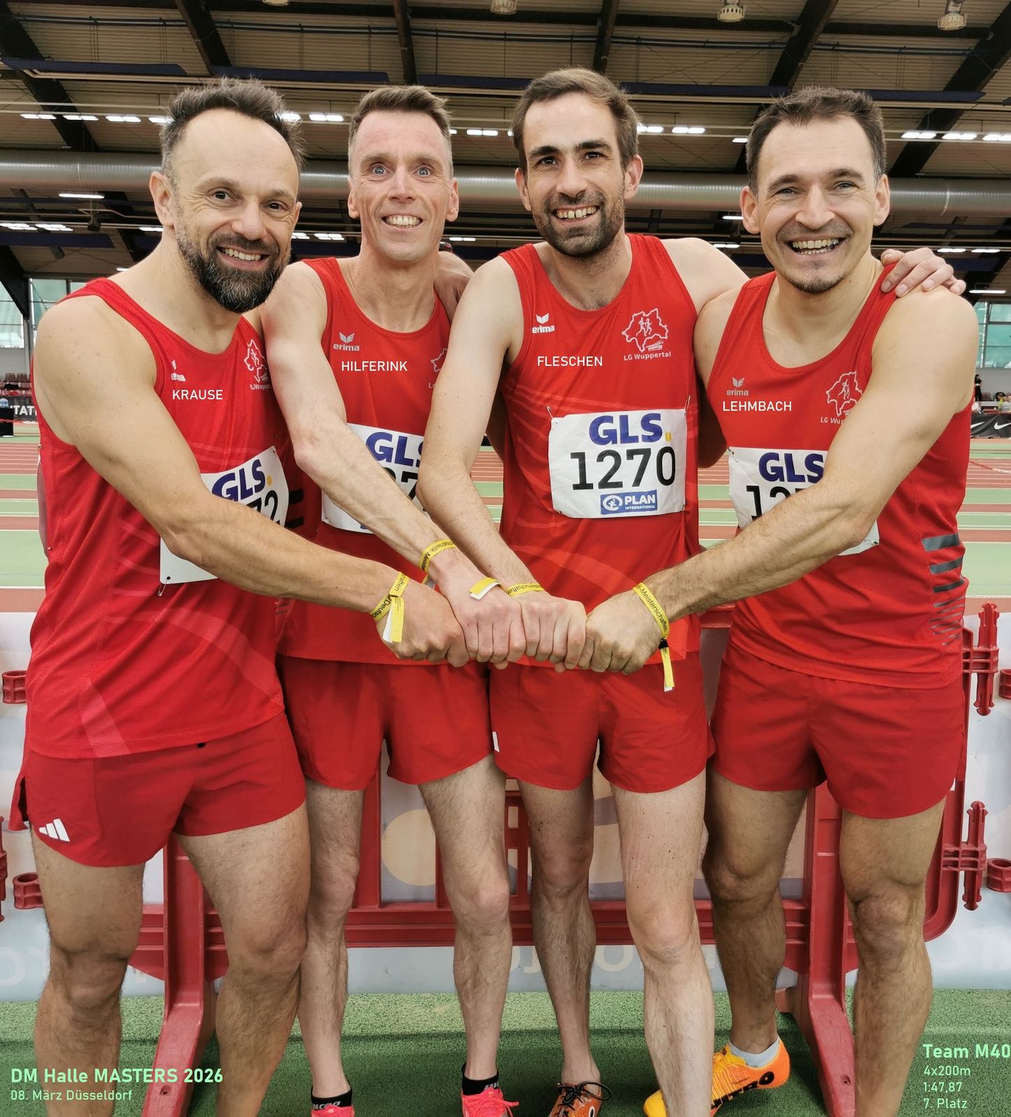 David Fleschen (M40): 800 m – 9. Platz in 2:10,47 / 1500 m – 6. Platz in 4:35,49 Ewout Hilferink (M45): 1500 m – 5. Platz in 4:28,09 Benjamin Lehmbach (M45): 800 m – 7. Platz in 2:16,35 / 400 m – 7. Platz in 58,67 Harald Damm (M65): 800 m – 6. Platz in 2:44,47 / 400 m – 5. Platz in 73,81 Staffel 4x200 m: LG Wuppertal, Platz 7 in 1:47,87 (Lehmbach, Fleschen, Hilferink, Krause)Ergebnisse leichtathletik.de