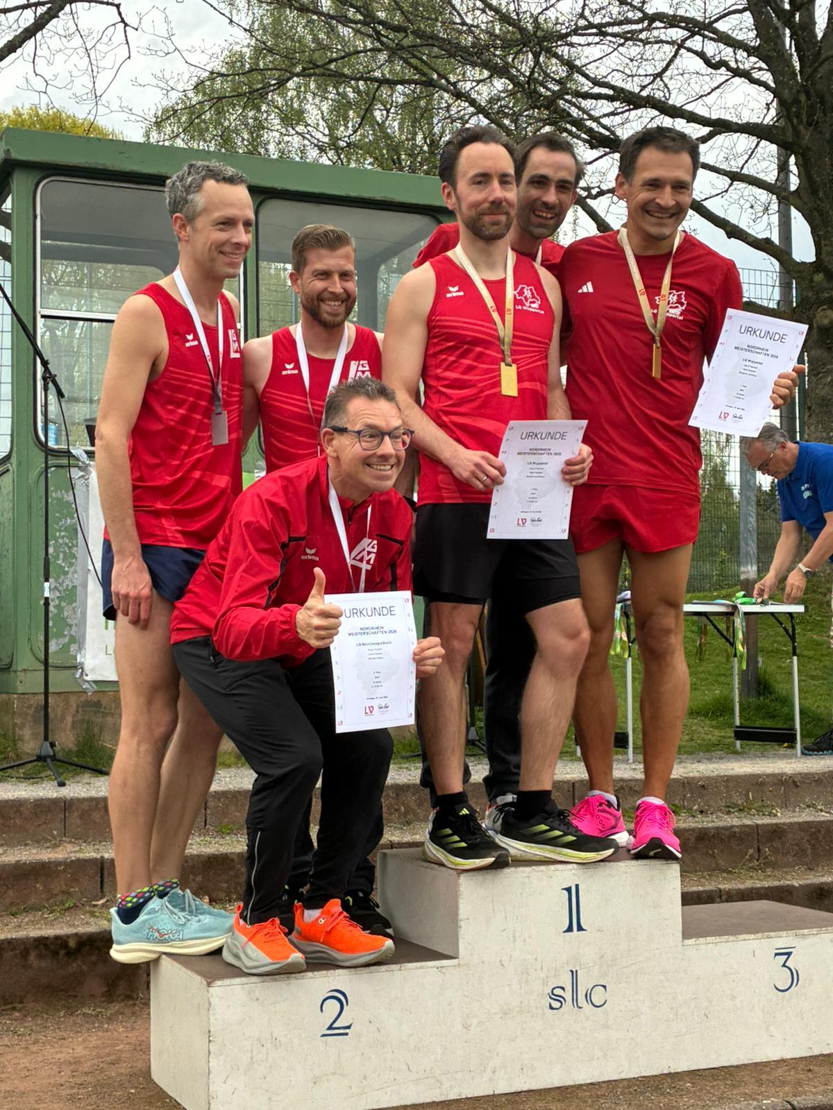 Unsere M50-Staffel gewann ebenfalls in ihrer Altersklasse mit einer Zeit von 4:28,61 Minuten. Herausragende Leistung kam hier von Startläufer Alexander Palm, der seine Zeit aus der Halle deutlich und zwar auf unter 63 Sekunden herunterschraubte. Gian Luca Madeddu, Reinhard Koch und Harald Damm vervollständigten das Team und feierten ihre Goldmedaille.